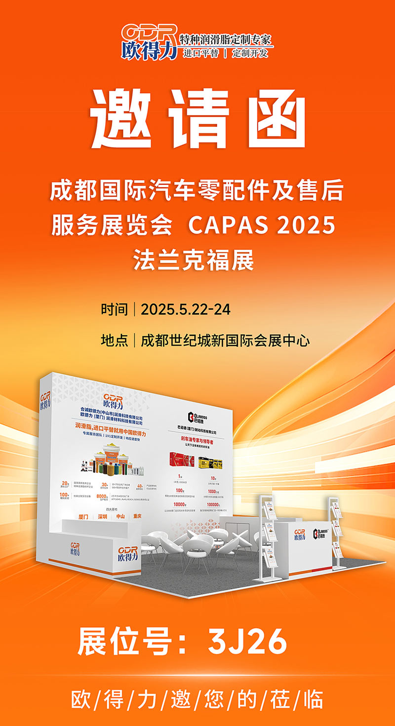 2025 成都(dōu)法蘭克福汽配展(CAPAS)将于 5 ±≥月(yuè) 22 – 24 日(rì'♣)在成都(dōu)世紀城(chéng)新國(guó)際會✔βγ(huì)展中心舉辦,作(zuò)為(wèi)西(xī)南(nán)最大β±¥≠(dà)的(de)汽車(chē)後市(shì)場'π(chǎng)展會(huì),上(shàng)屆展商、觀衆規模創新高(g€ε☆āo),本屆将吸引更多(duō)行(xíng)業(yè)力量參 ₩✘₹與。歐得(de)力潤滑脂将參展,其由合誠歐德力(中山(shān)市(shì))>Ω§<潤滑科(kē)技(jì)有(yǒu)限公司打造,專注特種潤滑脂研發生(shēng)産。本次展會(huì)≤✔歐得(de)力将展出适配汽車(chē)後市(shì)場(c≤hǎng)的(de)高(gāo)性能(néng)潤滑産©♥品,兼具優異性能(néng)與環保屬性,γ±通(tōng)過實物(wù)展示、技(jì)術(shù)講解等形式,•¥σ↓為(wèi)行(xíng)業(yè)提供專業(yè)潤滑方案,技(φ÷jì)術(shù)團隊也(yě)将現(xiàn)場(ch≥→©ǎng)答(dá)疑,助力拓展合作(zuò)。